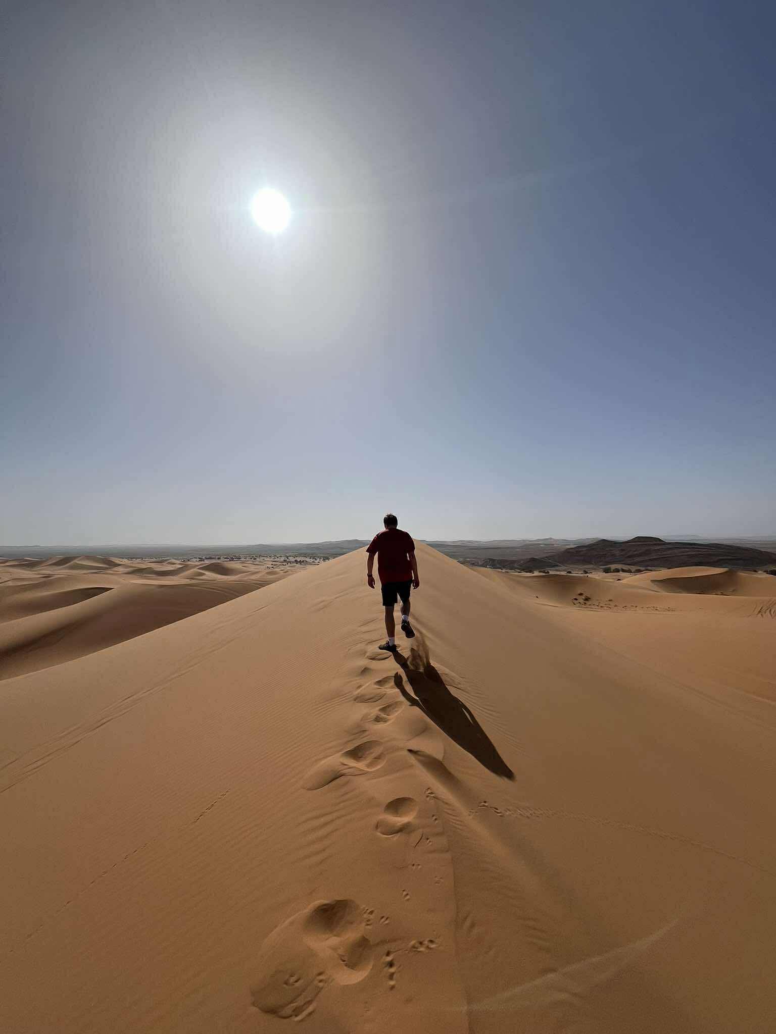 A one-hour camel trek to reach our desert camp, honestly brutal on the rear end, and I had concerns for the camels' wellbeing (though they're surprisingly strong). Would I do it again? Probably not. But watching the sunset over endless dunes and falling asleep under a sky absolutely blazing with stars? That was absolutely crazy and unforgettable. The heat here is intense, it rises quickly and demands respect.